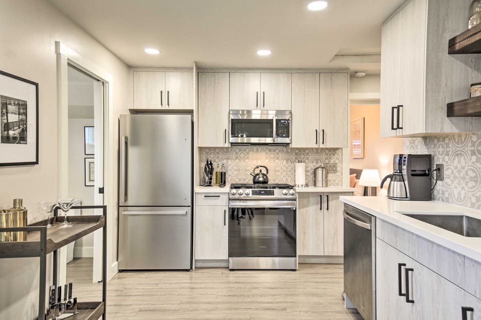 KITCHEN: Fully equipped w/ stainless steel appliances, microwave, coffee maker, toaster, blender, cooking basics, dishware/flatware, spices, bar cart