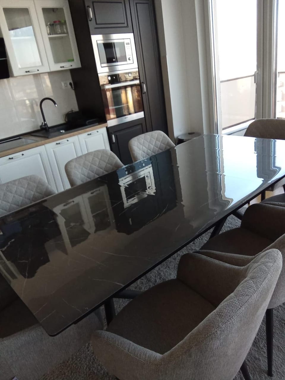 Er wachtte iemand in het appartement om ons op te wachten en de deur te openen. Erg vriendelijke en vrolijke man! Hij maakt een foto van iedereen zijn paspoort (hij neemt het dus niet mee als borg). Dit gebeurde ook bij de andere appartementen in Noord Macedonië waar wij verbleven. Het appartement is super schoon. Het uitzicht is indrukwekkend vanaf het enorme balkon. De woning is erg ruim waardoor je er gemakkelijk met 6 personen kunt verblijven. Er zijn 2 badkamers en 3 toiletten.