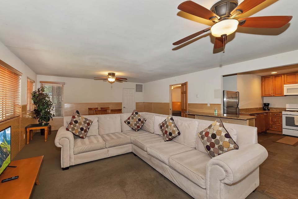 ✓ Family Room: The perfect space for relaxation, with a comfy oversized sectional sofa, a large flatscreen TV, and a wood-burning fireplace.