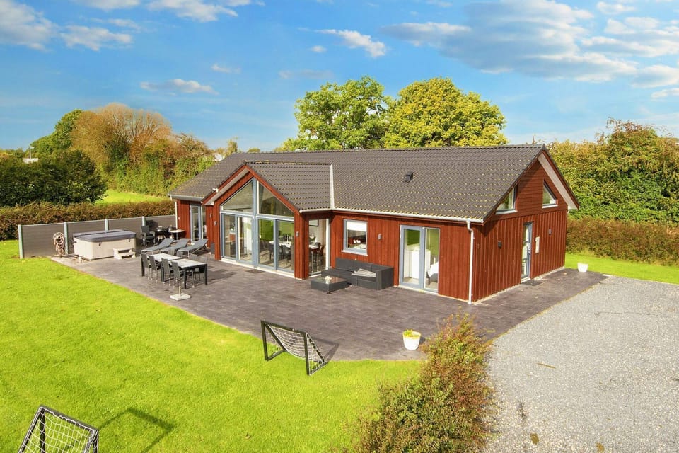In the lovely summer cottage area of Sandersvig, you will find this summer cottage with everything you need for a wonderful vacation. There is both a sauna and indoor and outdoor hot tubs, as well as various activities. The cottage has a large and bright kitchen/living room with high ceilings. In the room next to the living room, you will find the house's activity room, where you can enjoy table football, among other things. The house is practically furnished with five bedrooms, four rooms with a double bed, one room with a sofa bed for two people, and two sleeping places in the loft. The family room has direct access to the large terrace area, which is nicely furnished with several pieces of garden furniture and sun loungers. On the terrace, you also have access to the large outdoor hot tub, where up to seven people at a time can gaze at the stars with a glass of bubbly in the evening. Inside, the house continues its wellness area with an infrared sauna and hot tub in one of the bathrooms. Outside, children can also enjoy themselves for hours with a trampoline (used at their own risk/insurance), swing set, sandbox, and climbing frame, while the large lawn invites play and fun. The beach is known for being very child-friendly, and its white sand will also invite you to take many lovely walks along the water's edge. Not available for rental to youth groups.A refundable deposit might be charged closer to your check-in date. The security deposit ensures a smooth stay and covers any additional services or consumption charges.This deposit covers utilities consumed during your stay and any additional services that may be taken.The final amount will be adjusted based on actual meter readings, actual usage of extra services, and any remaining balance will be refunded within 21 days after checkout.This deposit simply acts as a prepayment for charges that you would anyways pay for, ensuring a seamless stay and check-out experience.