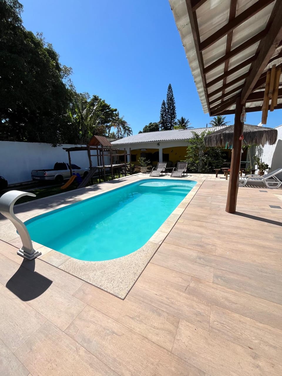 Yes, a swimming pool is available for use at Casa por do Sol amarelo. Enjoy the water!