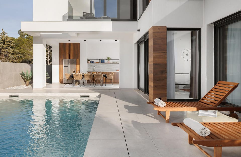 A vacation home straight out of an interior design magazine awaits you in this luxurious vacation home in Zambratija. Believe your eyes when you enter and enjoy the modern interior, which combines bright colors with stone and wood. The entrance with its large wall of windows is impressive in itself, but the large rooms promise comfort and relaxation. You can also look forward to the fitness equipment and a large sauna where you can sweat out your everyday stress. In the garden, you can relax in the whirlpool or refresh yourself in the pool. Further balconies invite you to retreat with a book or simply enjoy the sun.