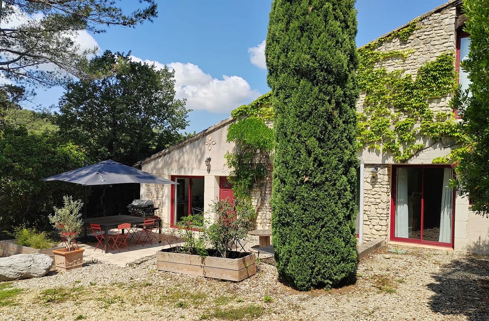 Garden-level floor of a large guesthouse, the cottage has 2 bedrooms each with its own bathroom and toilet, a large equipped kitchen, and a living room with a TV. Very bright thanks to the bay windows that open onto the terrace where meals can be enjoyed in the shade of a large parasol. Summer pool of 4 x 10 m shared with other guests of the house. Ideal for visiting the region where many tourist sites are less than 45 minutes away: Vaison la Romaine, Orange, Grignan, Avignon, Mont Ventoux, Dentelles de Montmirail... and all the picturesque and medieval villages of Vaucluse and the Provençal Drôme.