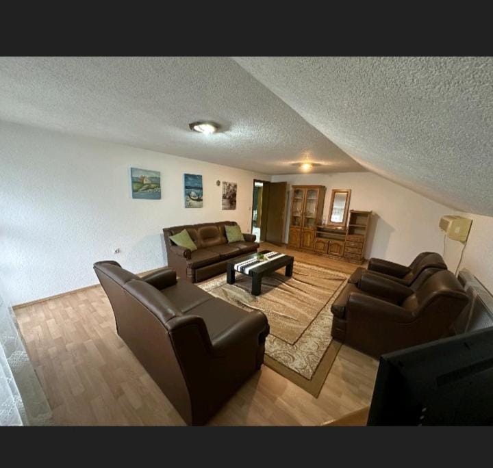 Obývacia miestnosť, kozene gauce a tv, pre viac ludi.