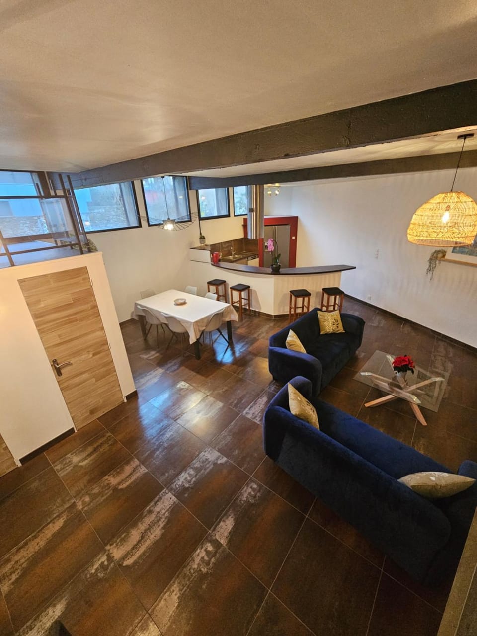 - Grand espace/volume salon avec cuisine comptoir