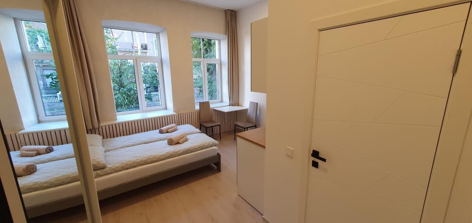 It bothers me when a toilet doesn't let my feet rest on the ground. And I'm not a short person. The mattress on both beds was incredibly soft in a way that you could only end up lying in the exact center on your back. Not comfortable for laying on my belly at all. There was only a very bright ceiling lightning in the room. Extremely bright for the evening. It would be nice to provide a bed lamp or a small table lamp with warm light. The walls were just empty apart from a huge clock (which fortunately didn't produce any sounds). Some pictures on the wall would make the room more cozy. The street outside the windows is quite noisy with traffic. Had to sleep with earplugs even with windows tightly shut. The wifi was unpredictable. In times very fast and in times not working at all (stopped working about 15 minutes before the check-out time, as if to tell you to get out :D).