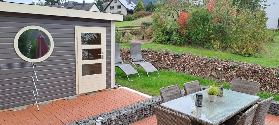 Die Sauna ist im Garten. Man kann vom Wohnzimmer aus direkt zur Sauna. Parkplatz ist direkt vor der Tür.