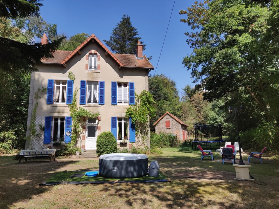 A romantic country home dating from 1870. It is well hidden on an estate, less than 358 kilometers from Paris. The house is located in a forrest area on a hill at the beginning of the Massif Central of the Puy de Dôme. There are various farm animals on the site, including chickens, peacocks, rabbits and sheep. There is a private garden with trampoline, swing and an inflatable Jacuzzi. You can enjoy lovely walks in the private woods. In addition to the living room and kitchen, there are four spacious bedrooms. WiFi + smart television with Netflix is available. Outside there is a picnic table and barbecue. There is a toddler chair and cot available. There is a beautiful swimming lake with sandy beaches five minutes away in the village of Lapeyrouse and the shops and facilities can also be reached within seven minutes (Carrefour & Lidl). The country home is completely private. Enjoy the peace and nature here.