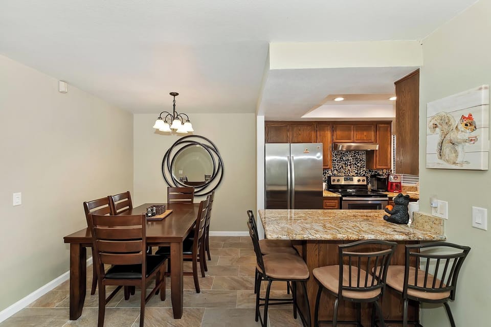 The fully stocked kitchen at The Bears Den is equipped with everything you need to create family style meals or a quick breakfast before you head out the door to hit the slopes. Enjoy the use of a gas oven/range, microwave, toaster, coffee maker & Kerig! There is a breakfast bar countertop with 3 barstools as well as a solid wood dining table with 6 chairs for you to gather together and enjoy eachothers company over a home cooked meal.