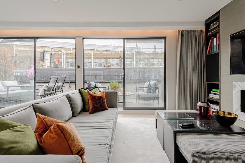 The top-floor reception room offers a versatile space that can be tailored to your lifestyle, whether as a cozy lounge or a mix of a more formal reception space with a sophisticated office. This inviting room opens onto a south-facing roof terrace, providing ample natural light and a beautiful outdoor space.