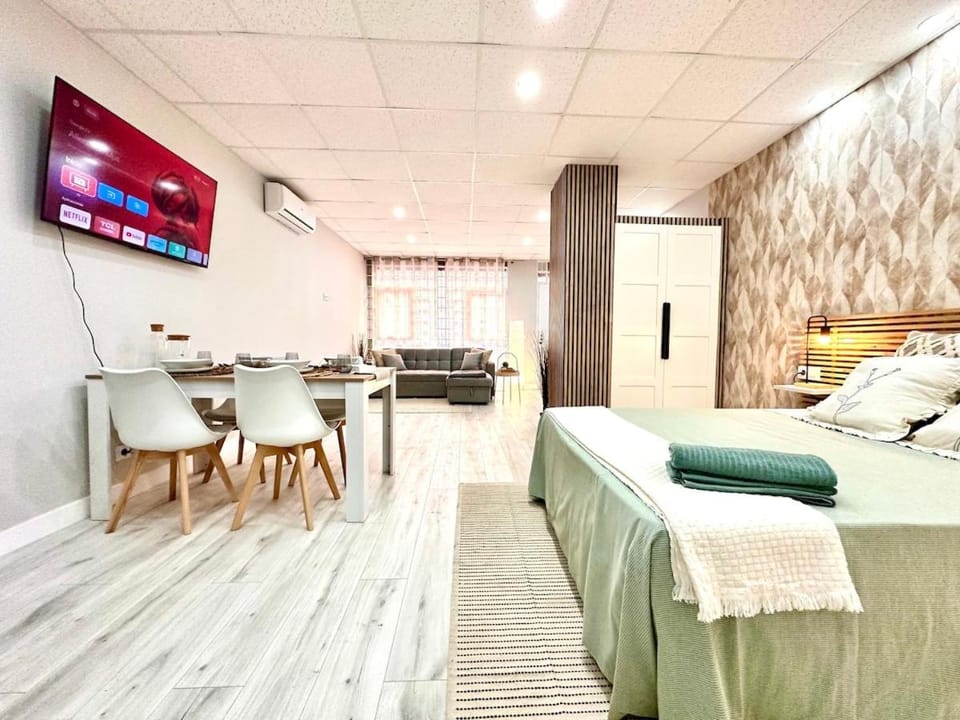 Al entrar al estudio, no dejaron ningún detalle de cortesía, ni siquiera unas botellas de agua. Me confirmaron de que había cafetera y cuando llegamos allí, no estaba. Al día siguiente ya me contestaron y se acercó un chico con una cafetera nueva que fue un detalle, todo hay que decirlo. Tampoco tenían tostadora, ni exprimidor de zumo. El baño no tenia basura pequeña para tirar los papeles, tampoco tenía gel y champú de baño, ni colgador de toallas. Echamos en falta juegos de sábanas de recambio mas que nada para el sofá cama y mas toallas. Se nota que el estudio antiguamente era un local comercial porque no está insonorizado, y al ser un bajo se oye cualquier ruido de la calle. La única ventana que tiene el estudio, por fuera tiene la persiana metálica con el aire acondicionado puesto, que no deja cerrarla completamente y entra algo de claridad a primera hora de la mañana.