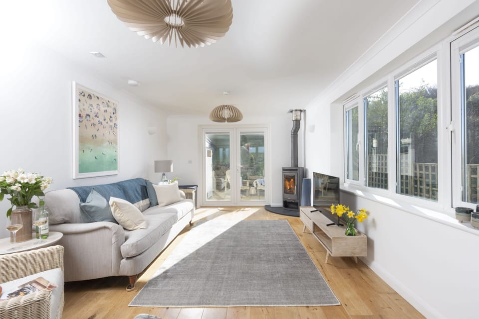 Step inside this beautifully designed Cornwall holiday cottage and be greeted by calming coastal tones and a sense of seaside serenity. The light-filled sitting room features two plush sofas, a cosy armchair, a wood-burning stove, and a Smart TV - perfect for relaxing after a day exploring the South West Coast Path. French doors open onto a sunny patio, letting the fresh sea breeze flow through the space. At the heart of Poldreth lies a sleek, contemporary open-plan kitchen and dining area, fully equipped for your self-catering holiday in Cornwall. The kitchen includes everything you could need, from a coffee machine and wine fridge, to high-end appliances. Enjoy a relaxed breakfast at the breakfast bar or dine together at the spacious table for six. A separate utility room with tumble dryer adds to the home's convenience.