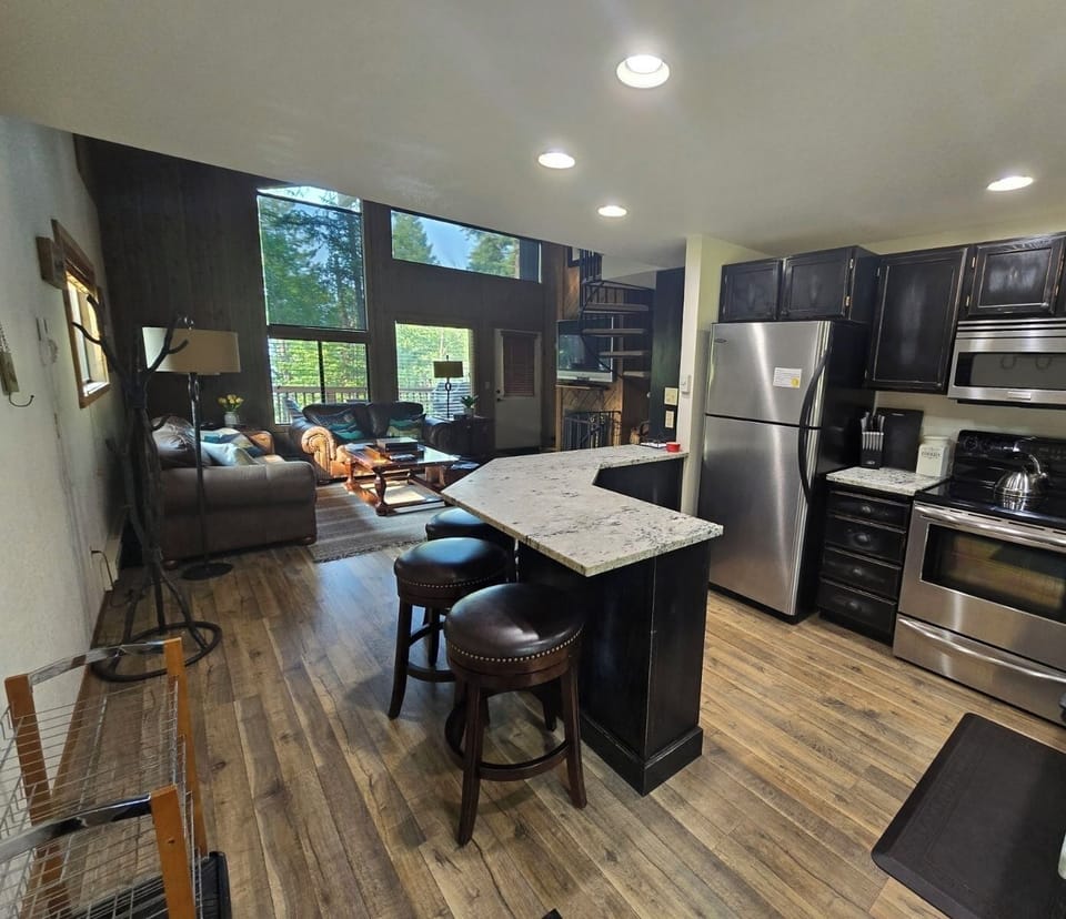 AIR CONDITIONED upgraded 2 bedroom plus loft fully equipped condo in secluded Ptarmigan Village on Whitefish Mountain. High end finishes include laminate floors on main level, new carpet, granite countertops newer fixtures in kitchen and bathrooms, stainless steel appliances and comfortable beds. FULL SIZED WASHER AND DRYER in newly renovated lower bathroom with in floor radiant heat.. There is a beautiful private deck with propane BBQ, bistro set for 4 plus dining set for 4 with view of the lake. Lower walkout level has 2 bedrooms, one with king bed and walk out patio seating area also with view. Second bedroom has 2 twin beds. Bathroom with shower and laundry on this level. Main area has living room with leather furniture, wood-burning fireplace, wall mounted HDTV, wifi, kitchen with eating bar and full bathroom with tub/shower combo. (Firewood is available for purchase at the office. After hours, a bundle of firewood can be purchased at the kiosk )Third bedroom is the upper loft with queen bed. **Circular staircase not suitable for small children or people with mobility issues**