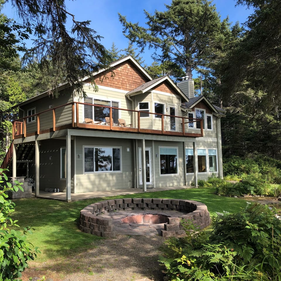 Ocean Cliff has over 2800 square feet and both floors have gas fireplaces, tile and marble throughout, beautiful fully-equipped kitchens, deluxe bathrooms and spacious master bedrooms with ocean views. Off the main entry is a utility room and mud room with a large shower. Our sunken fire pit offers the ideal location for campfires and s'mores, and the one-acre private forest is perfect for exploration. A short walk to the Ocean Crest Resort takes you to a beautiful stairway down to the beach...or you can drive down in 90 seconds, convenient for hauling kids and stuff.