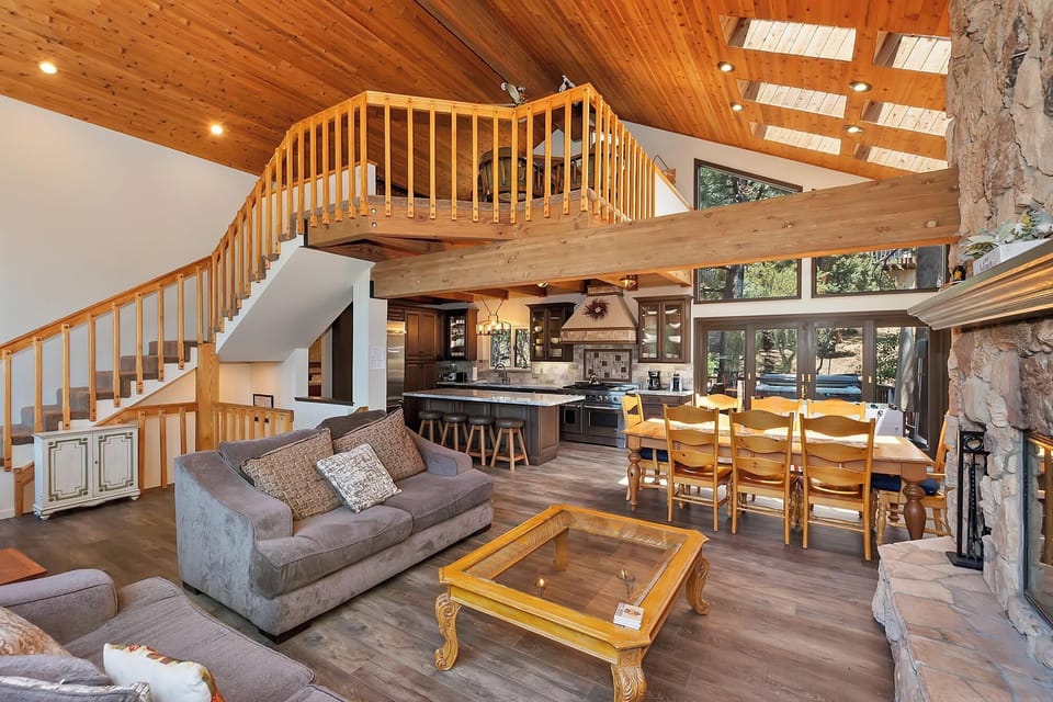 Yosemite Ridge welcomes you with a warm and inviting open-concept great room that showcases rich wood finishes, tall ceilings, and dramatic windows framing the spectacular forest and ski slope views. Relax in the comfortable seating area beside the floor-to-ceiling stone fireplace, stream your favorite shows on the smart TV, or simply soak in the peaceful alpine setting.