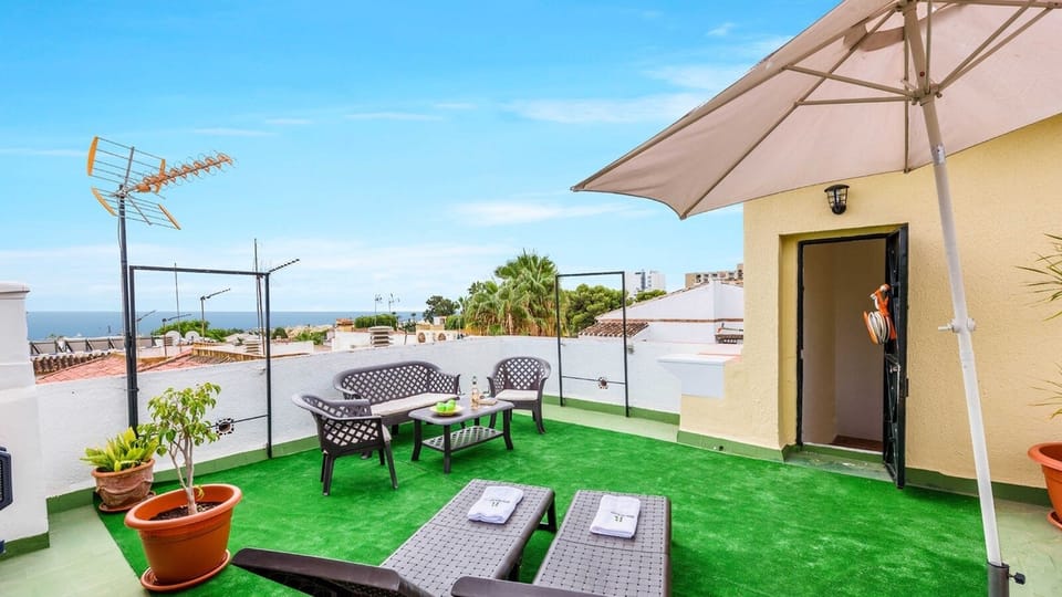 Last, but not least, the second and last floor of the villa, which is actually the rooftop terrace. Here, you will find sun loungers, a parasol and a chill-out area, ideal for relaxing and enjoying the splendid sea views beyond the roofs of Benalmádena.