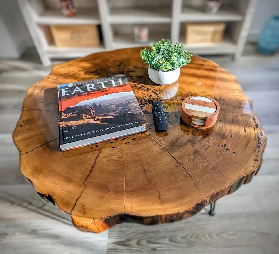 Across from the living room, you'll find a fully stocked coffee and tea bar with an assortment of coffee, tea, and a Keurig coffee maker.