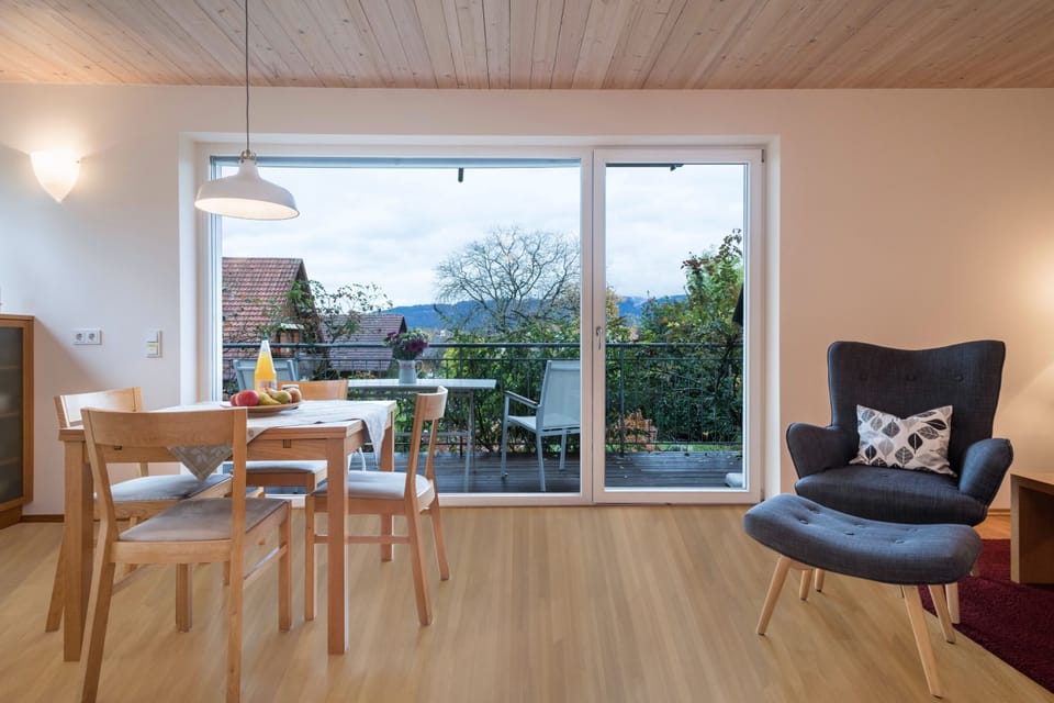 Located within a small oasis, surrounded by fruit trees and with a beautiful mountain view, the property is to be found about a 10-minute walk away from Lindau. As part of a Family House, this lovely and independent holiday apartment consists of a living room, a well-equipped kitchen, a bedroom as well as one bathroom and can therefore accommodate 2 people. Additional amenities include Wi-Fi. Start the day on your private balcony with a nice and hot cup of coffee and prepare for an adventurous day by the beautiful Lake Constance and its fantastic surroundings. There is a farm shop in the property, where you will be able to taste and/or buy a variety of home-made products. The central bus stop with connections to various excursion destinations in the charming surrounding area, as well as many restaurants and shopping facilities are reachable within a 5-minute walk. You will also find the nearest supermarket within 450 m or 6 minutes on foot. A variety of leisure activities such as cycling tours along Lake Constance, mountain hikes or swimming in Limare (adventure pool with sauna), which is about 10 minutes away, will make your stay an unforgettable experience. The closest beach (Strandbach Eichwald) is only a 7-minute drive away, or 3,1 km.