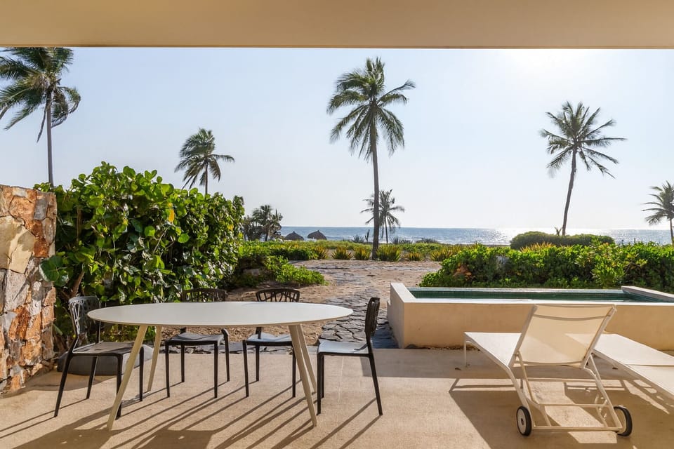 With this stunning beachfront pool surrounded by palm trees in Playa Blanca, Zihuatanejo. Enjoy uninterrupted ocean views, direct beach access, and a luxury beach club experience just steps from your villa.