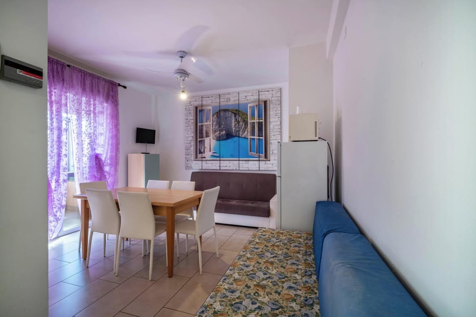 We offer a two-room apartment for summer rentals, located in a quiet area yet close to all amenities. The property features comfortable spaces with standard furnishings. The living area opens onto a large, furnished terrace that extends the living space through a French door. The living room includes an open-plan kitchen, a table for six, and a double sofa bed. The bedroom has a double bed and an additional single bed. The bathroom is spacious, with a window and a shower niche. The apartment is air-conditioned and has a parking space within the condominium area.