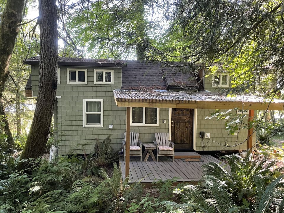 The Hideaway Tiny House is located just steps away from Rainier BaseCamp, nestled in the trees on our own private forest. Built in 2018, it features two lofts with queen beds, a fully equipped kitchen with a refrigerator, range/oven, microwave, dishwasher, Keurig coffee maker and toaster. A small covered deck with a clear roof allows you to enjoy the lush beauty of the Pacific Northwest. A perfect escape, a cozy peaceful retreat in the woods, just a few miles from Mt. Rainier National Park.