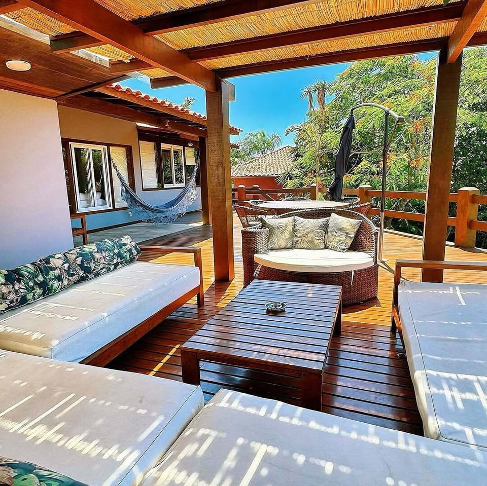 Luxury house located in the most renowned condominium in the region, in the left corner of Geribá beach, offering large area, fully equipped American style kitchen, 42 inch TV, Wi-Fi, heated water, large outdoor area through a beautiful and huge deck with barbecue just 1 block from the most coveted beach in Búzios with exclusive exit from the condominium with umbrella and beach chairs proper to the house and a few meters from the leisure area of the Condominium, offering structure with swimming pools, tennis court, soccer field, children's area, bar and more.