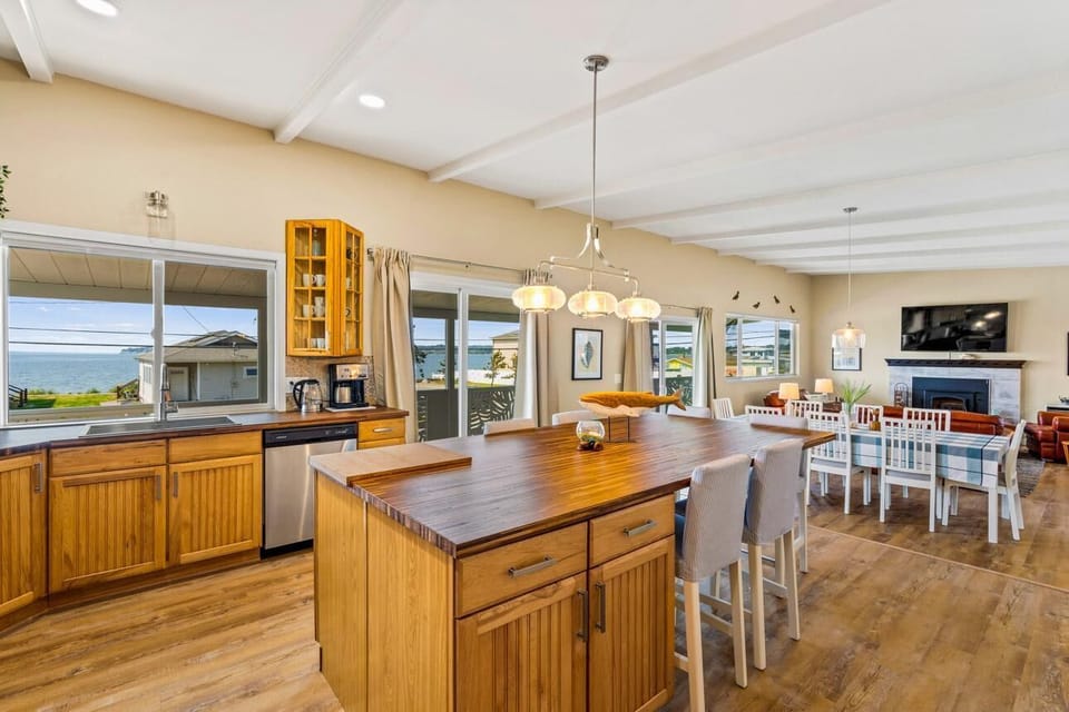 This upstairs apartment features incredible views of the beach, towards the community of Birch Bay, and of the picturesque creek. The open concept kitchen, dining room, and living room is over 40 feet long. It can accommodate 6 people sitting at the island and 10 people at the dining room table (great for the gathering hospitality suite) There are two large bedrooms; one features an office area complete with printer, the other has a double sink vanity bathroom attached. There is also a queen size air mattress to accommodate up to 6 people in this unit. NO SOFA SLEEPER only air mattress. There’s a second bathroom with a stacking washer and dryer, vanity and toilet. There’s one large shower that is shared. Two sets of sliding doors open onto the massive deck with Adirondack chairs for lounging, and a small table for outside eating. There is excellent Wi-Fi and a 65 inch television with streaming content. A wood fireplace makes it cozy in the winter. In addition to the deck, there are plenty of outside shared amenity spaces. There’s a covered gazebo with a state of the art barbecue. There is a fish cleaning station in the back of the property for those that like to go fishing, clamming, or crabbing. There are Adirondack chairs and tables around the property for lounging and enjoying the fire pit by the creek. The entire property can be rented and is ideal for large business or family groups as it can accommodate up to 20 people.