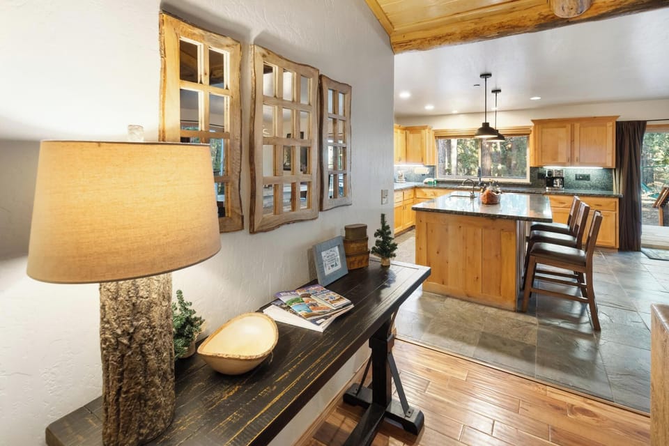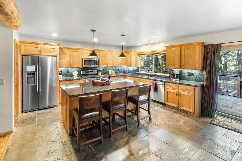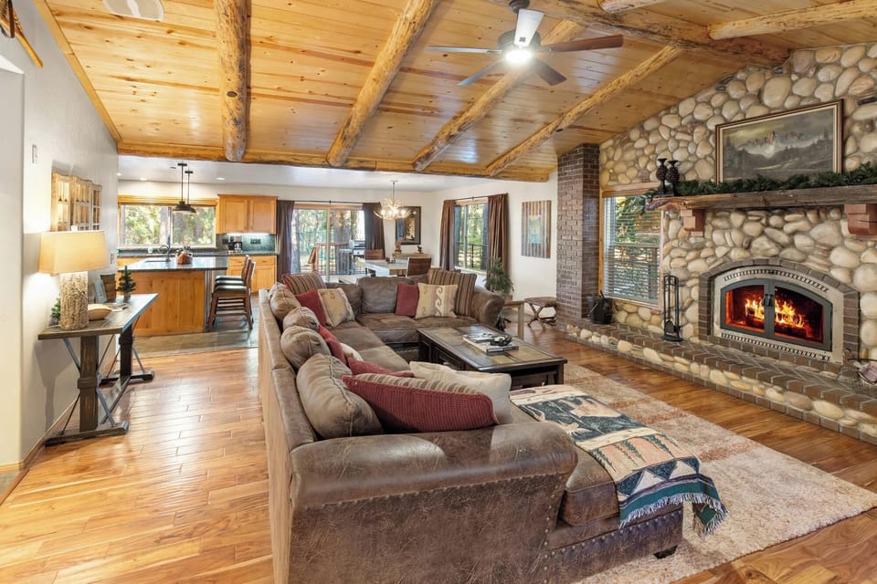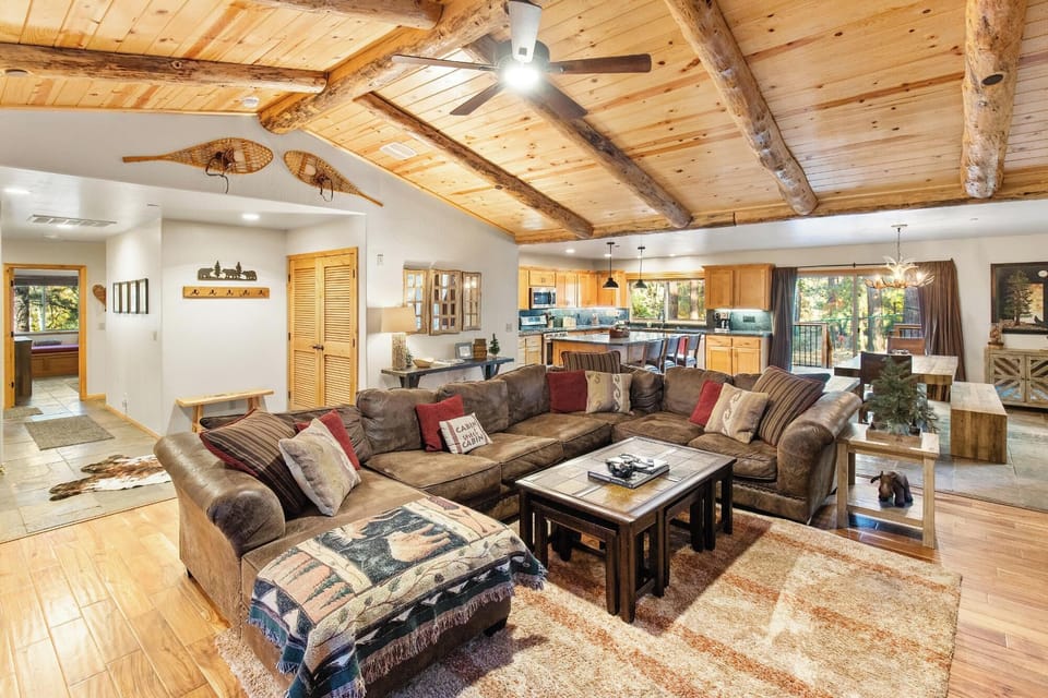 Step into a cozy, open-concept living space designed for quality time and relaxation. Gather around the beautiful stone fireplace or stretch out on the plush leather sectional for a movie night with the whole crew. With premium streaming options and a welcoming layout, this is the heart of your mountain retreat.