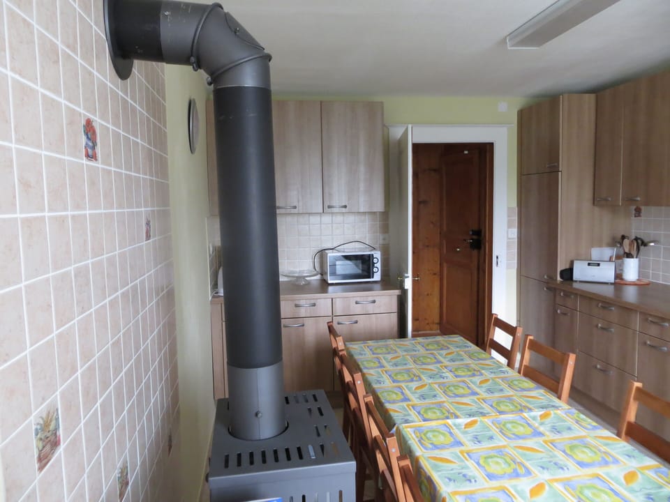 Crockery / cutlery, utensils and cookware, electric kettle, coffee machine, toaster, raclette and fondue appliances, electric stove, oven, microwave, extractor fan, fridge, freezer, dishwasher, dishwasher linen, vacuum cleaner, iron and ironing board. Toilet paper and household paper.