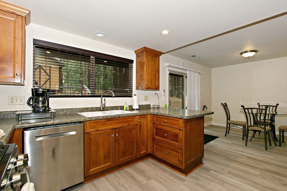 The fully stocked kitchen with modern amenities offers everything you need to make a family style dinner or a quick breakfast before you head out to the slopes. Including a gas double oven/range, microwave, dishwasher, coffee maker and toaster. The dining table with seating for 4 is located in the kitchen and is a great place to gather with your group for meals or a fun game of cards! Also, enjoy the use of a larger solid wood dining table located off of the living room with seating for 8.