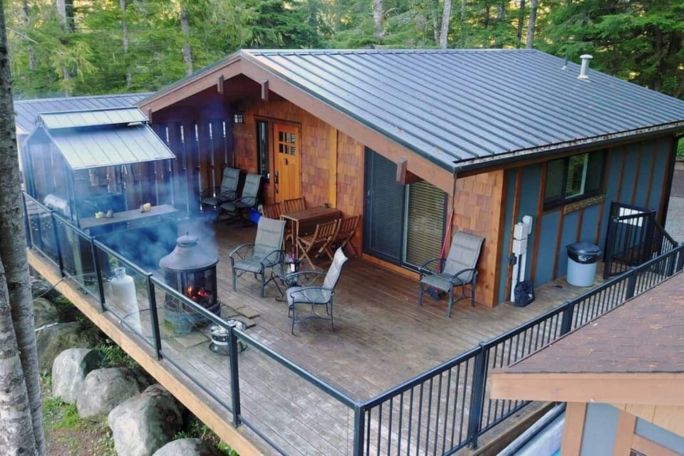 The cottage is at the end of a dead end road, up on a hill and offers our guests privacy. It is surrounded on 2 sides by an old growth forest, and the ocean and mountain views from the hot tub and the large deck are spectacular!