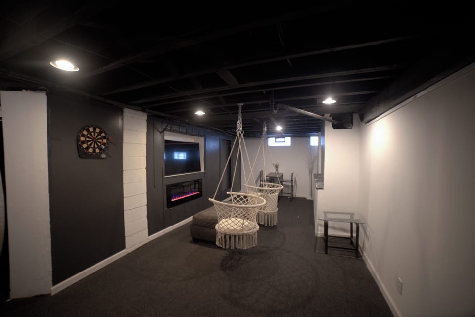 The best part of staying here is the big comfy couch and the 86 inch TV in the living room. The basement is also great for some fun with friends or family. Play cards at the poker table, play darts, relax on the hanging chairs while watching your favorite movies, or play video games in the "hidden" game room.
