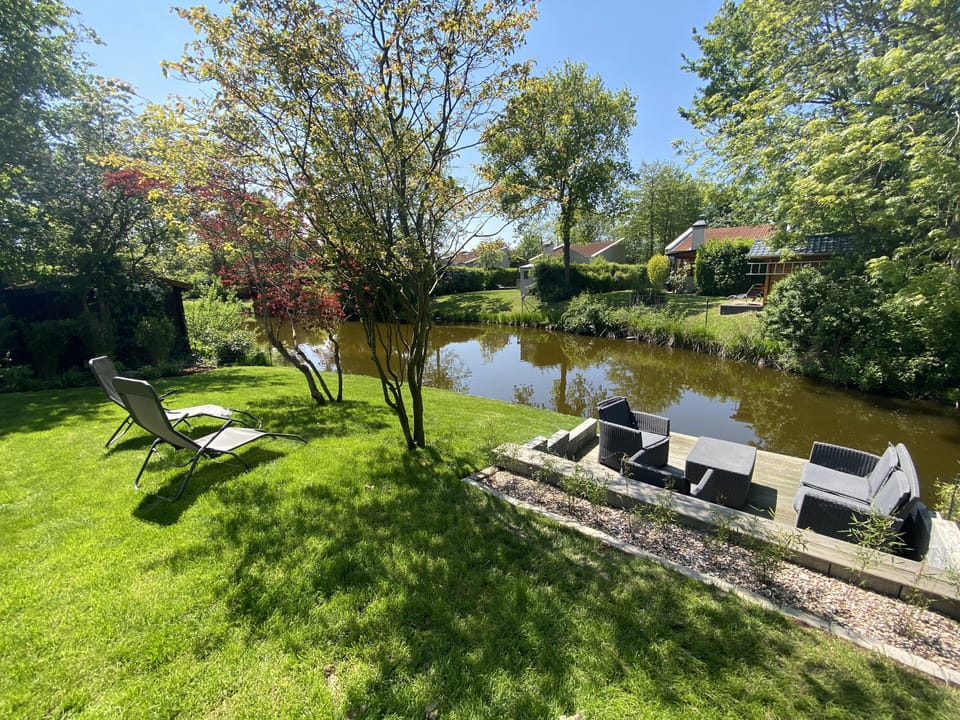 The house (90sqm) is located on a very spacious, about 620sqm large, southwest facing property, which runs on a small lake, allows a lot of privacy and is beautifully grown with trees and shrubs. On the spacious terrace you have a garden table with chairs for 6 people available as well as several garden chairs and a parasol. The garden is not visible from the street !! In front of the house are 2 parking spaces, which are framed by a rosary. Other parking spaces are located diagonally opposite across the street.