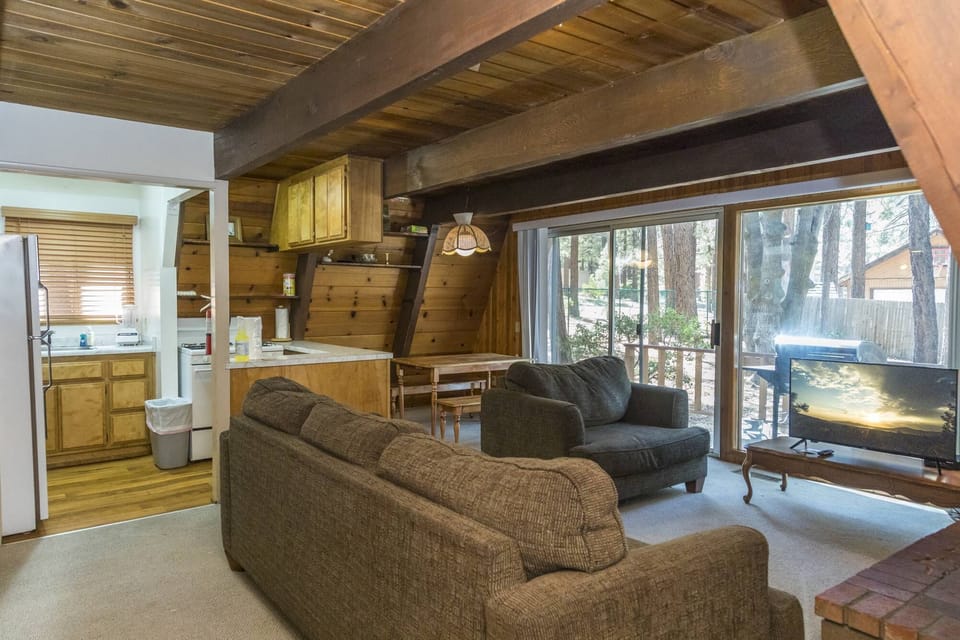 Inside you will find all the basic amenities for a relaxing stay in Big Bear. The family room has a wood burning fireplace and large Flatscreen TV.