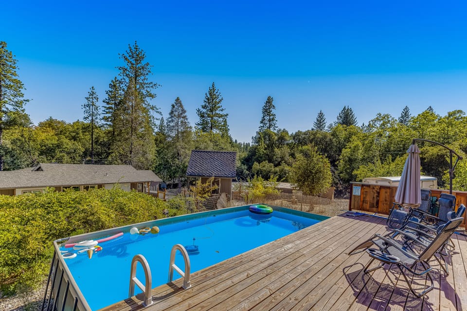 Escape to this fun property in Murphys, close to shopping and restaurants as well as local wineries and tasting rooms! With three bedrooms and a kid-ready basement bunk room brimming with books and toys, there is plenty of space here for your entire family! Meals will be a snap with the help of your well-equipped, full indoor kitchen plus a fantastic outdoor kitchen complete with a full-size refrigerator and brick pizza oven! Inside, the main living area features plenty of seating, high ceilings, a wood-burning stove, and a flatscreen TV for streaming your favorite channels, while outdoors, you'll enjoy access to a large yard, a refreshing private pool with a sundeck, and even a large TV on the furnished patio complete with an outdoor firepit. Additional amenities include a playhouse for young visitors, a disc golf basket, and a basketball hoop in the front driveway. Central A/C adds comfort throughout.