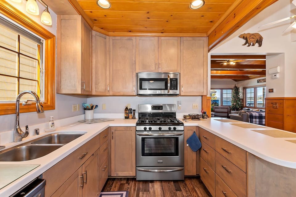 Features: Lake Views, Lakefront, Gas BBQ, Board Games, Foosball Table, Flatscreen TV, Fireplace, Stainless Steel Appliances, Carpet and Wood Throughout, Coffee Bar, Coffee Pot, Stove, Oven, Microwave, Dishwasher, Double Door Fridge, Sectional Couch, Decks, Porch Swing, Washer and Dryer, Linens and Towels Provided.