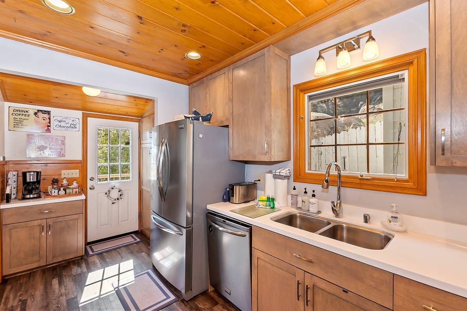 Inside Lazy Lake, the open-concept living area exudes warmth and comfort. Natural wood beams and a striking blue carpet reflect the hues of Big Bear Lake. Relax on the plush couches, enjoy the warmth of the stone fireplace, or watch your favorite shows on the flatscreen TV. The kitchen, equipped with stainless steel appliances and a large island, offers plenty of space for meal preparation. Enjoy your morning coffee from the coffee bar or the dining table with seating for four.