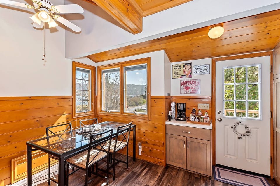 Retire to the upper level for a restful night. The first bedroom features a queen-size bed, flatscreen TV, and a charming window nook with scenic views. The master bedroom boasts a king-size bed, private deck, and a second coffee bar. The master bathroom includes double vanity sinks and a shower/tub combo. The third bedroom has two twin beds and access to a back deck with a porch swing.
