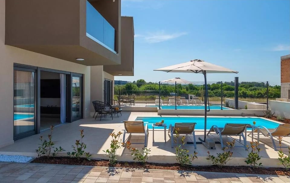 Villa Esmeralda II offers 130 m² of living space and comfortable accommodation for up to 6 guests, making it an ideal choice for families or couples seeking a relaxing holiday in Istria. The villa is arranged over two floors and provides everything needed for a carefree summer stay.On the ground floor, there is a fully equipped kitchen connected to a dining area for six people, a spacious living room with direct views of the private pool and terrace, a room with a sofa bed for two guests, and a bathroom.From the living room, guests have access to the outdoor terrace, furnished with comfortable garden furniture – perfect for enjoying a morning coffee in the fresh air. The outdoor area also features a private swimming pool with sun loungers and an outdoor barbecue, ideal for relaxing afternoons and pleasant evening gatherings.The first floor offers two double bedrooms with double beds, a shared bathroom, and a balcony equipped with a table and chairs, providing a lovely view of Novigrad.The villa is fully fenced, ensuring privacy for guests, and includes one free private parking space.Villa Esmeralda II offers all the comforts needed for a perfect summer holiday.Important notesGroups of young people under 26 years of age are not allowed.Villa Esmeralda and Villa Esmeralda II are rented separately; group bookings are not permitted.NOTE: New houses have been built in front of and next to Villas Esmeralda and Esmeralda II, which has changed the surroundings compared to the existing photos.