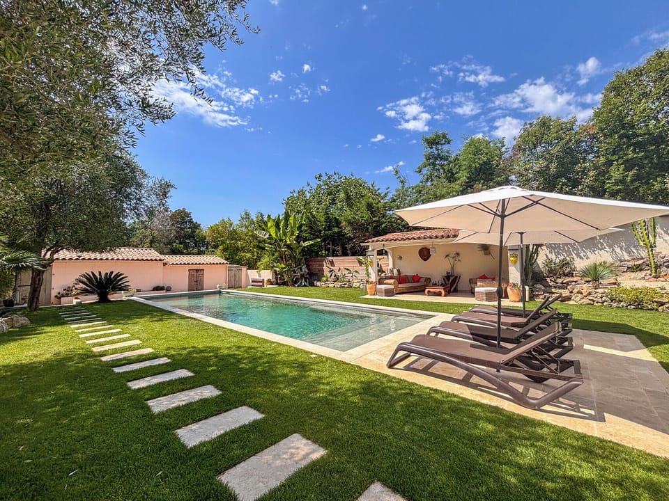 A pool house is equipped with garden furniture, sun loungers, a petanque court, and a ping-pong table.