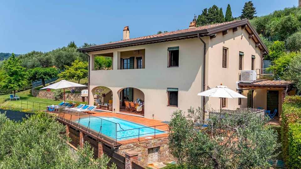 Villa Jasmine, located on the hills overlooking the renowned town of Viareggio, offers a spectacular panoramic view of Lake Massaciuccoli and the Versilia coast. The golden beaches of Versilia, just a few kilometres away, have always been a popular Italian and international tourist destination, as is the renowned Torre del Lago which was the residence and inspiration for the Maestro Giacomo Puccini who stayed there for long periods. This classic Tuscan villa stands out for its essential lines and its panoramic and luminous spaces, designed to guarantee maximum comfort. On two floors, it is simply furnished, combining traditional Tuscan materials such as terracotta floors, stone and marble, wooden beamed ceilings, and alternates Tuscan furnishings with pieces of shabby chic to make the guests' stay unique. The numerous panoramic areas, both in the garden and in the villa, offer breathtaking views of the sea, making for an unforgettable holiday.
