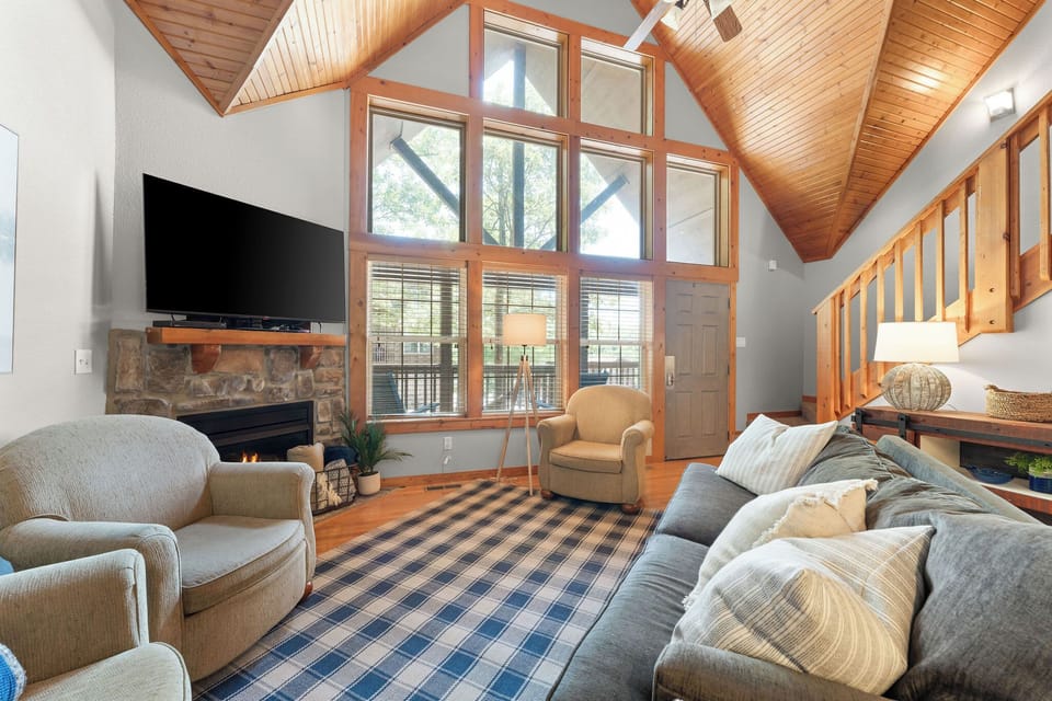 The spacious front porch greets you with two rocking chairs ready for sipping on some sweet southern tea! Inside the vaulted ceilings make the open living area feel extra spacious. Cozy up in front of the stone gas fireplace on a cool evening or watch a movie on the flat screen TV. Either way, plenty of room for everyone to relax. And the living room couch is a sofa sleeper that you can pull out at night to sleep those last two guests. Head into the fully stocked kitchen to cook up some of your favorites. The cabinets are full of all your normal kitchen utensils and appliances; pots, pans, a blender, mixing bowls, plates, electric mixer, etc. Pull up a chair at the bar to keep the cook company or sit together at the 6-top dining table to enjoy that home cooked meal or tasty takeout! If you’d rather enjoy your meals outside, the screened-in back porch offers outdoor dining! Or cozy up on the outdoor couch and soak in the sounds of the community lake seen through the beauty of the Ozark trees!