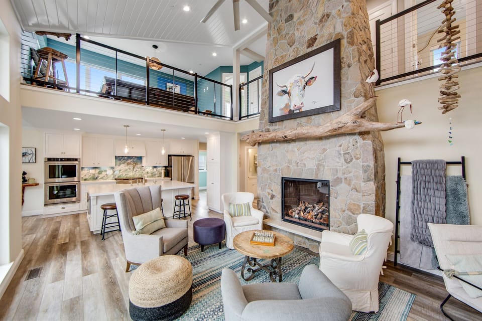 * Floor to ceiling rock gas-fireplace with intimate seating for conversation and your favorite glass of wine