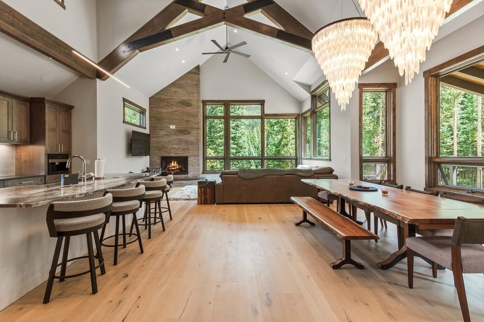 Venture downstairs to the first-floor living space, featuring a cozy fireplace, 66" TV, and kitchenette with a wine fridge. Then, step through the sliding glass door to relax and unwind in the new spacious Arctic Spas hot tub for 10. Down the hallway is a convenient mudroom with ski lockers, as well as a laundry room with a full-sized washer and dryer.
