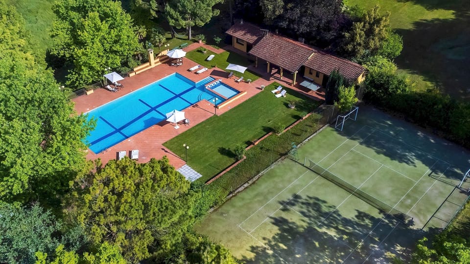 Once past the automatic gate, a paved driveway descends for about 60 metres between the first planted lawns of the park and leads to a large open area where cars can be parked. A stone walkway leads to the main door of the villa, in front of a large lawn. Trees and flowers colour this corner of the park which will enchant you while consuming breakfast or lunch in the shade of the patio. The park extends all around the villa, opening onto large green areas with lush trees offering welcome oases of shade. In particular, the south-facing part slopes gently down towards the regulation-size synthetic grass tennis court and the big 220 sq m) swimming pool, surrounded by a large solarium. This area of the park is dominated by the large Club House with a 50 sq m central patio, equipped with a brazier, table and chairs, which separates a large kitchen from the area with changing rooms, bathrooms and sauna.
