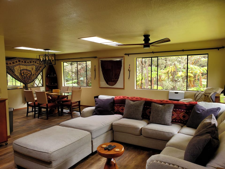 Escape to your own piece of paradise nestled within the lush and serene embrace of the native Hawaiian forest. This spacious 3-bedroom house offers a unique opportunity to reconnect with nature and unwind. Immerse yourself in the vibrant ecosystem right outside your door, where the gentle rustle of leaves and the soft chirping of wildlife provide the perfect backdrop for experiencing Hawaii's native forest. Discover the beauty of Volcano from this delightful 3-bedroom house. With 2 queen beds, 2 full beds, and a cozy futon, guests will feel right at home. Enjoy the convenience of heating, an iron, washing machine, and WiFi. The 2 bathrooms offer both a bathtub and shower for ultimate relaxation. A spacious bonus room with an additional queen bed provides extra sleeping capacity for large groups. A great place to call homebase while you're away, we hope you enjoy your stay.