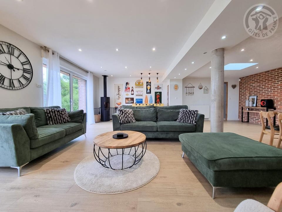 Ground floor: Living room opening onto the garden with a 160cm TV, Wi-Fi (fiber optic), Bluetooth speaker, foosball table, and wood-burning stove.