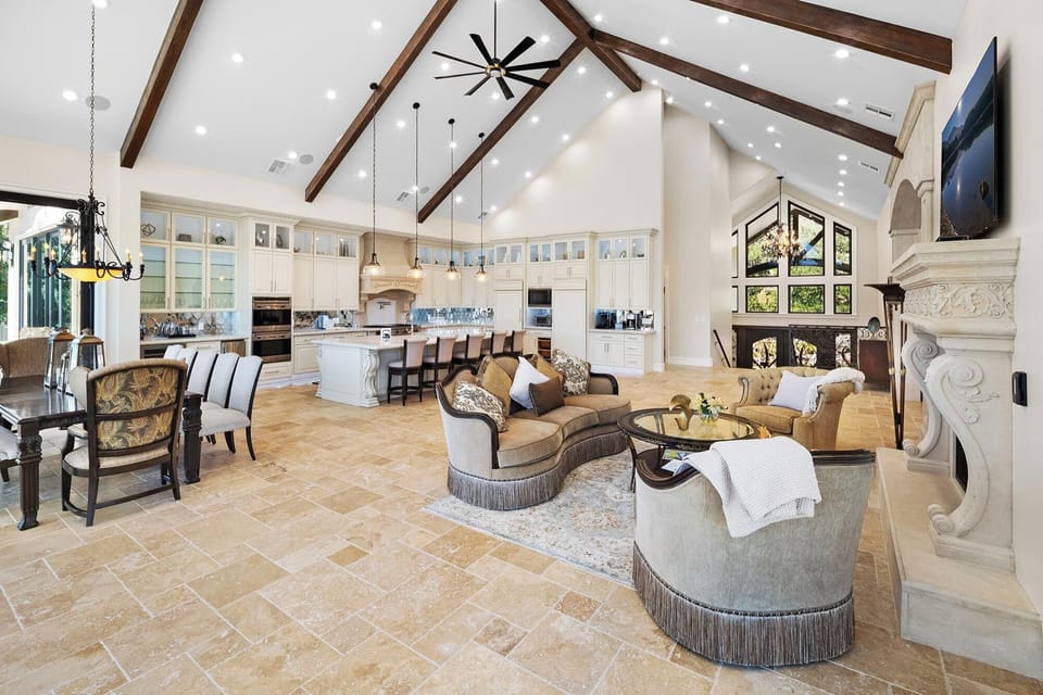 ✹ Spacious Open Living Area w/ Soaring Vaulted Ceilings & Floor to Ceiling Windows w/ Panoramic Lake Views Smart 85” TV + Custom Stone Gas Fireplace See Through to Both Living Rooms
