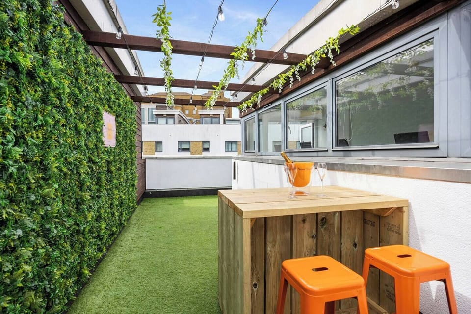Our penthouse floor is another great entertaining space with a hair and makeup bar complete with hair dryers and 'Hollywood' make up mirrors, plus a small lounge area with a TV (and great views over Brighton). There is an additional sofa bed up here if you need it. This sunny and bright floor also has a large penthouse roof garden with champagne bar for those pre-evening drinks or summer yoga classes!