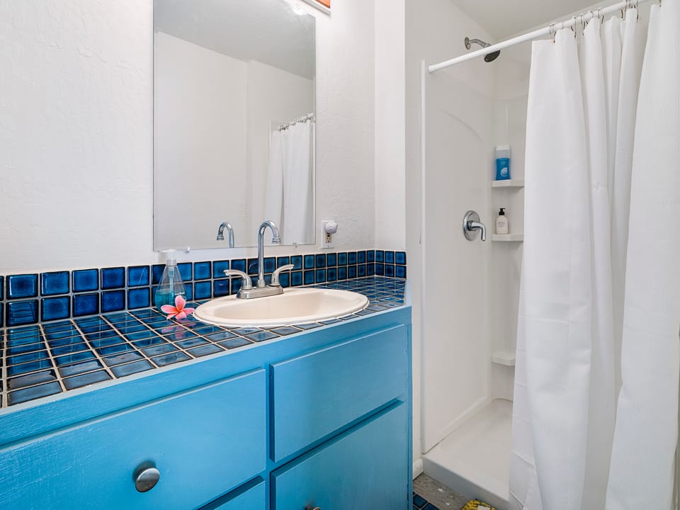 Remodeled with upgraded kitchen and bathrooms, new flooring, and Hawaiian décor and furnishings - the home is all one level, so there are no stairs to climb (except for two small steps from the entry to the main part of the house). There are ceiling fans in every room, and AC in the bedrooms. Bedrooms have subtle Hawaiian themes to add to the atmosphere, and feature Cal King sized beds. The beach themed master bedroom offers a luxurious memory foam mattress and has an attached bathroom with shower. The rainforest bedroom has a door to the back patio and also has a memory foam mattress. The ocean bedroom features a skylight. The hall bathroom with tub/shower is shared between these two guest rooms.